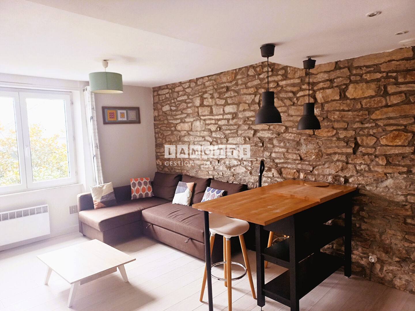 Ce lumineux et traversant appartement de type 2 vous séduira dès l'entrée par les pierres apparentes qui apportent caractère et chaleur à l'espace de vie.
