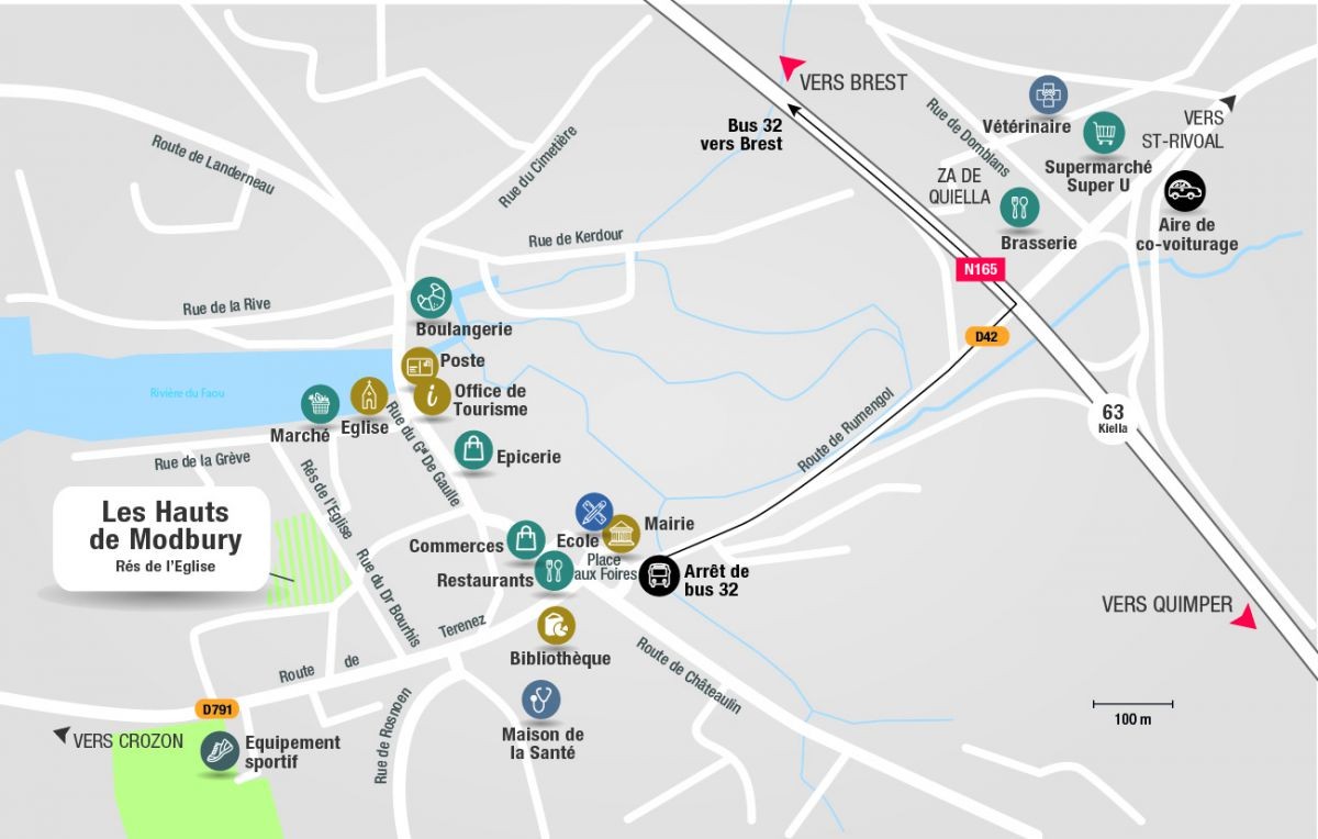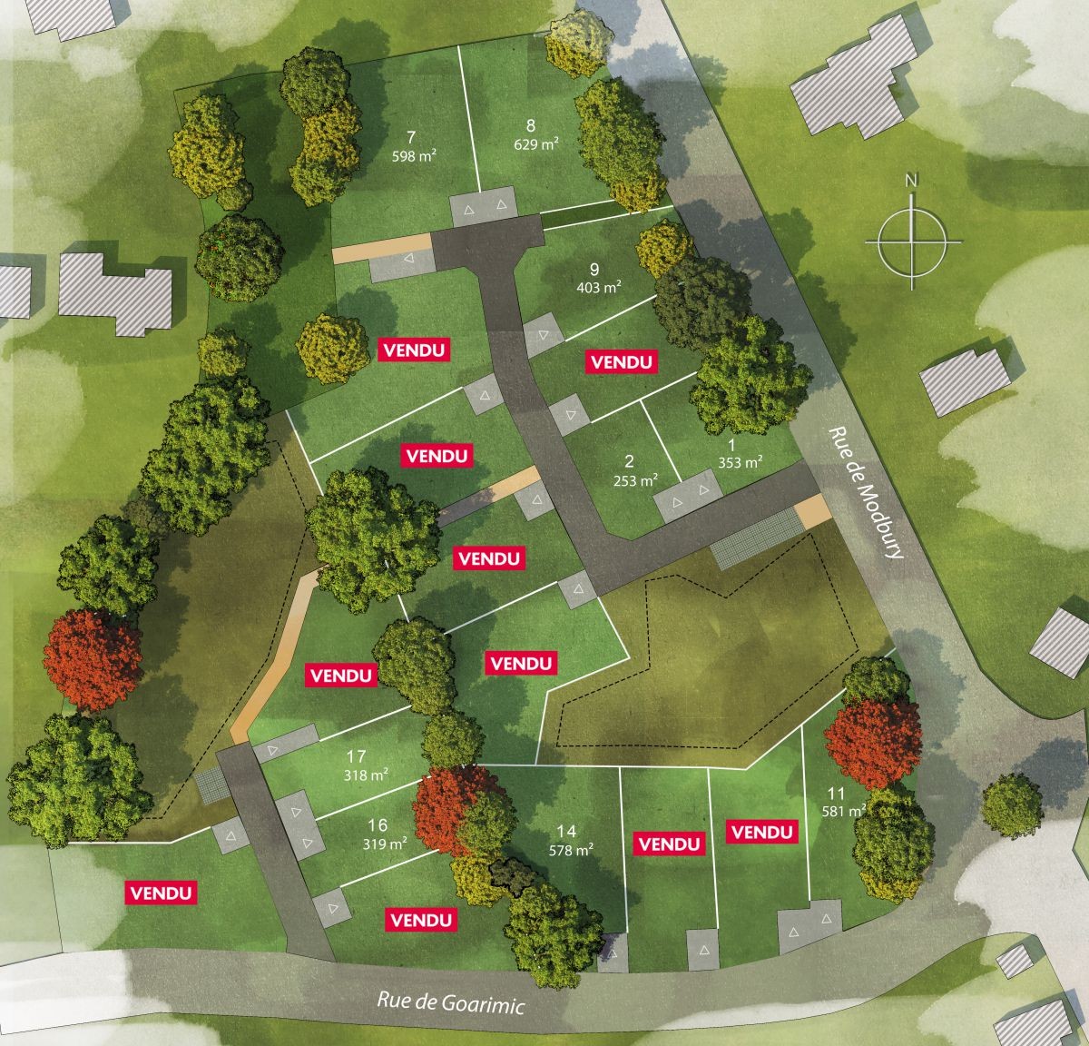 À seulement 300 mètres du centre-bourg, le long des rues de Modbury et Goarimic, le projet Les Hauts de Modbury propose 19 terrains à bâtir. Bordé à l’ouest par un verger et la ferme de Goarimic, le lotissement s’intègre parfaitement dans son environnement, avec des espaces verts soigneusement aménagés et des zones naturelles préservées. Une opportunité unique de devenir propriétaire dans une commune accueillante et pleine d’authenticité !