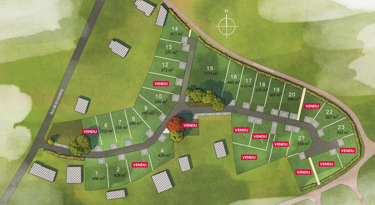 Encadré de terrains construits de maisons individuelles, le nouveau lotissement s’inscrit dans une logique d’urbanisation, en continuité des habitations présentes rue de la Corderie et chemin des Villes Guinio. Ce tissu pavillonnaire calme, dans une impasse en bordure du parcours du golf, propose un espace central de convivialité, avec clôture végétale.