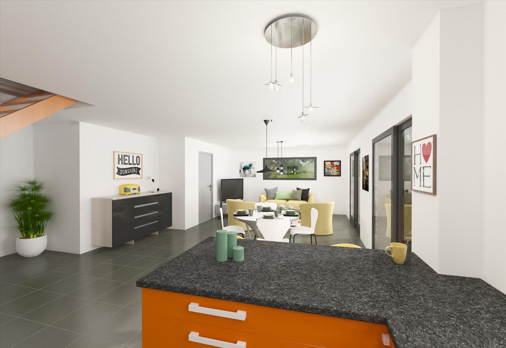 L’intérieur s’organise autour d’une vaste pièce de vie ouverte, généreusement baignée de lumière grâce à de larges baies vitrées, créant une atmosphère chaleureuse et conviviale. La cuisine ouverte sur le séjour prolonge naturellement cet espace, idéal pour partager des moments en famille ou entre amis.
