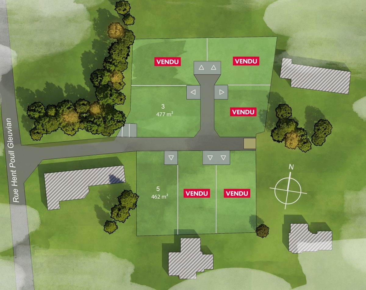 Situés rue de Kerandouret, les derniers terrains disponibles au sein du lotissement Hent Poull Gleuvian proposent des surfaces variées. En faible pente et avec une orientation sud, ces parcelles de 435 m² en moyenne offrent un espace généreux pour concrétiser vos projets de construction dans un environnement calme et verdoyant.