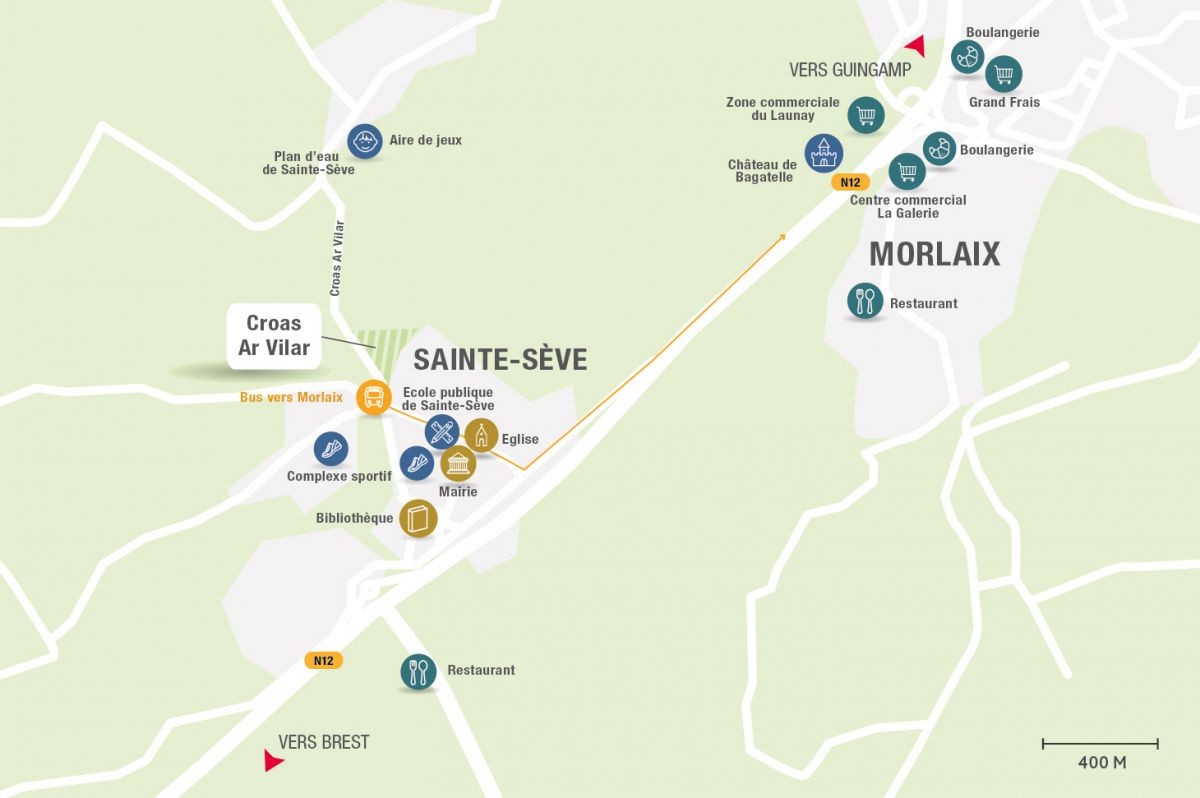 À Saint-Sève, le programme Croas Ar Vilar s’inscrit dans un cadre de vie recherché entre dynamisme et nature. Située au cœur du bassin morlaisien, la commune séduit par sa proximité avec Morlaix et ses services. Ces terrains à bâtir offrent une opportunité durable pour concrétiser votre projet de maison neuve à Saint-Sève, dans un environnement pratique et attractif.