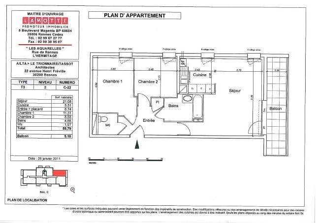 L'HERMITAGE, Rue de Rennes- Bel Appartement 3 pièces au 2ème étage d' une résidence calme et récente, comprenant une entrée avec placard, un séjour, une cuisine ouverte, 2 chambres, une salle de bain, wc, et balcon.
