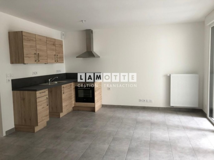 PONT DU CENS - Un appartement de type 2 au pied des transports comprenant une entrée, une grande pièce de vie avec cuisine ouverte équipée (hotte, plaque, four) et balcon exposé ouest, un dégagement menant à une chambre avec placard donnant sur une terrasse et un jardin, une salle d'eau, wc.