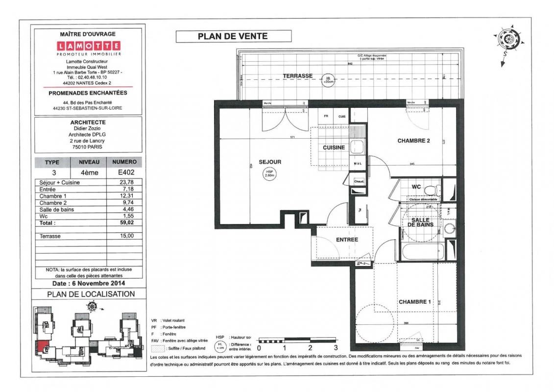 SAINT SEBASTIEN SUR LOIRE - Appartement de type 3 situé dans une résidence récente au dernier étage composé d'une entrée avec placard, une cuisine aménagée et équipée (hotte, plaque de cuisson, four) ouverte sur le séjour donnant sur une terrasse, deux chambres, une salle de bains et WC séparés.