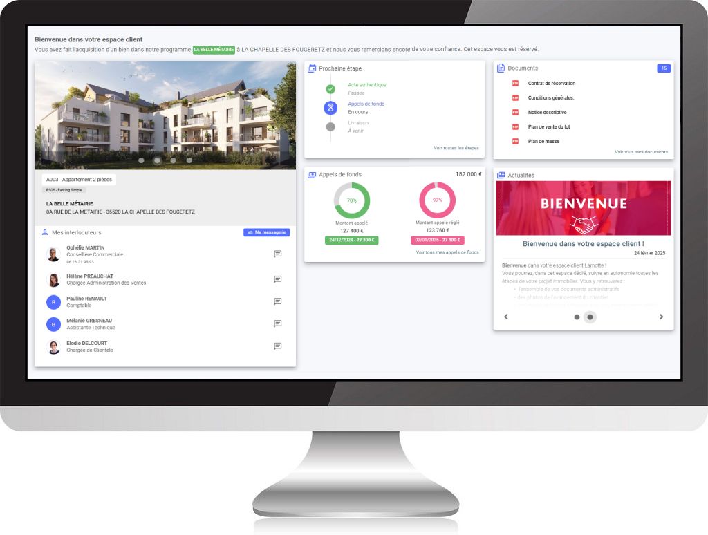 « Mon espace client » est votre espace connecté pour vous accompagner de A à Z, depuis l’acte de réservation de votre bien jusqu’à la livraison, et pendant l’année de parfait achèvement.