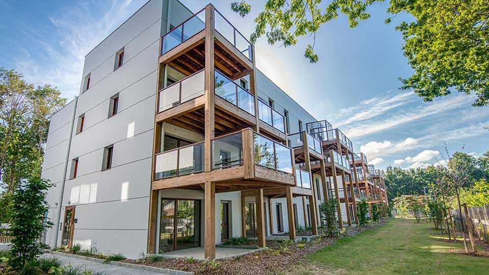 Nichés dans la végétation, les trois bâtiments de la résidence neuve à Nantes offrent une ambiance particulièrement agréable. Son architecture aux lignes épurées, s’est inspirée des pêcheries sur pilotis, typiques de la côte Atlantique : les vastes terrasses et verrières, font aussi toute l’âme d’un lieu où l’on aime se retrouver et partager.
