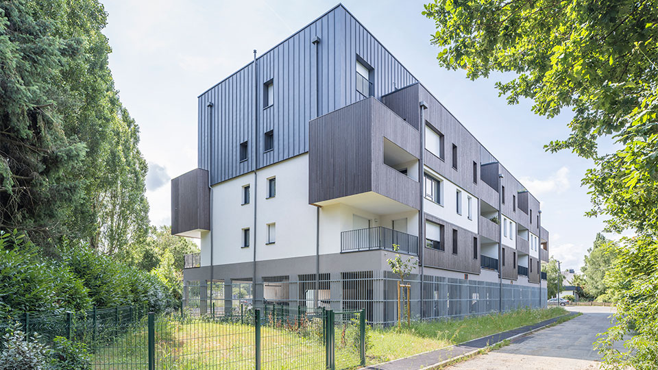 Entre rives du canal et apaisant parc urbain, la résidence en immobilier neuf à Betton épouse sereinement son environnement. Ses façades claires offrent une image contemporaine.