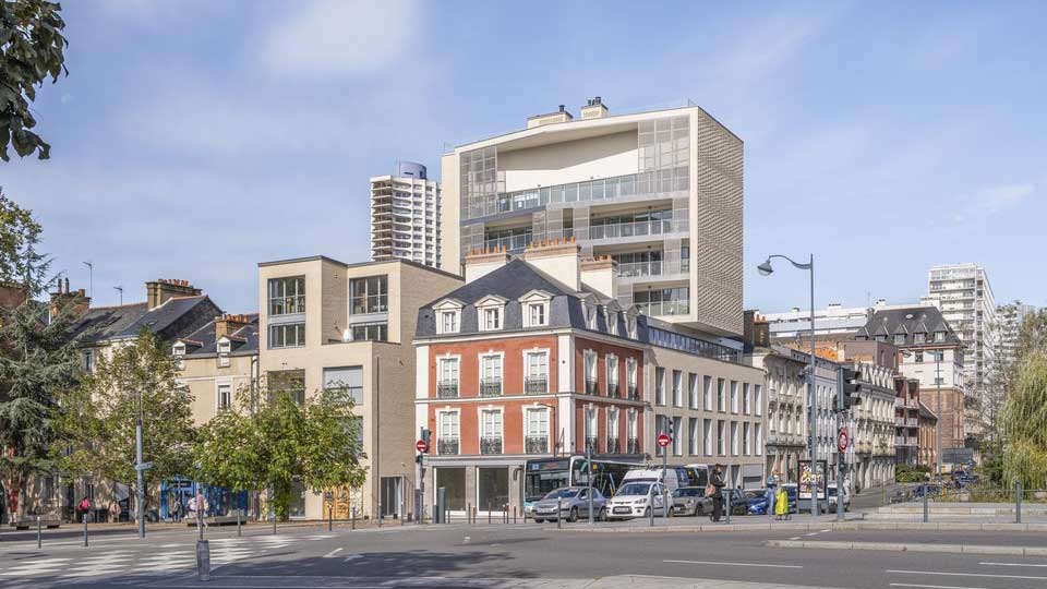 C’est aujourd’hui une résidence de 30 logements, avec 2 locaux commerciaux en rez-de-chaussée, sur une parcelle de 1 100 m². L’un des enjeux majeurs a été la conservation de la maison d’angle […], tant dans la conception architecturale que la conception technique.