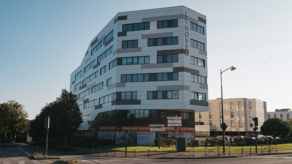 À l’entrée est de la ville de Rennes, Le Noven est un bâtiment signal de facture contemporaine. II comporte un rez-de-chaussée (avec un restaurant d’entreprise) surmonté de six étages et offre une surface totale de 4 500 m² de bureaux.