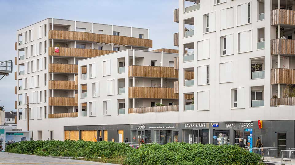Dans son environnement citadin, la place commerçante du quartier, elle aussi en renouveau, s’étend à ses pieds. Senséa s’épanouit tout en lignes épurées et failles végétales laissant pénétrer naturellement le soleil. L’ensemble est résolument lumineux, joliment ponctué de balcons habillés de ganivelles répondant avec les cheminements piétons et espaces arborés en contrebas.