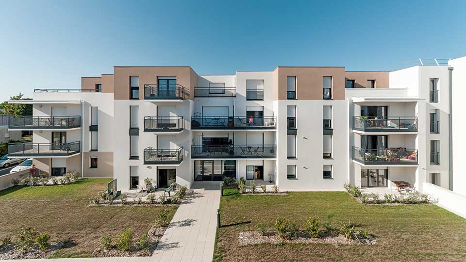 Résidentiel par nature, l’ensemble immobilier neuf près de La Rochelle se compose de trois bâtiments de trois étages et un bâtiment d’un étage. Les couleurs sont sobres et élégantes – pierre, blanc, brun, gris -, les lignes épurées et l’effet contemporain parfaitement maîtrisé. La résidence bénéficie d’une voie d’accès réservée à sens unique et d’un charmant jardin clos paysager.
